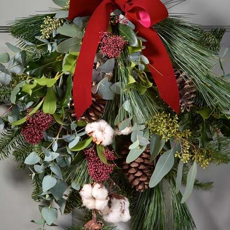 A swag (like a flat bouquet you hang on the door) of gorgeous fresh Christmas flowers, expertly arranged by a local florist.