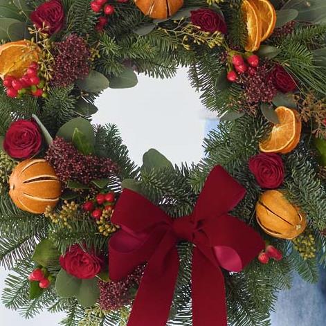 A classic Christmas wreath of fresh foliage and dried fruits, expertly arranged with care by a local florist.