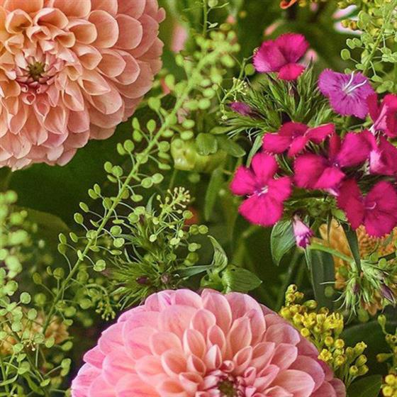 A beauty of a handmade bouquet with flowers in vivid colours plus at least three stunning dahlias.