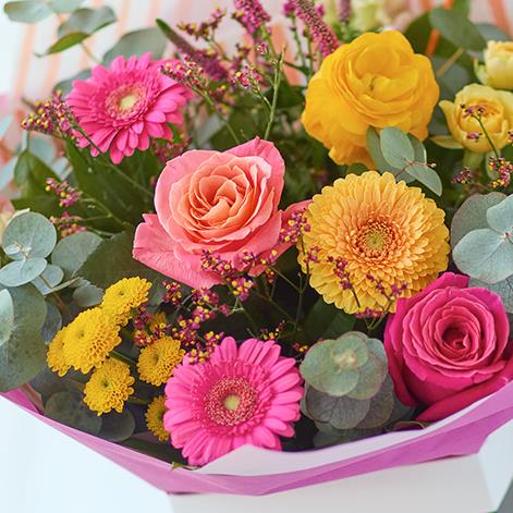 A bouquet of fresh, vividly coloured flowers expertly arranged by a local florist.
