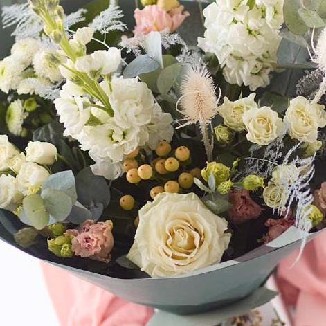 A striking bouquet of fresh and dried flowers in crisp, clean colours, chosen and arranged by the florist.