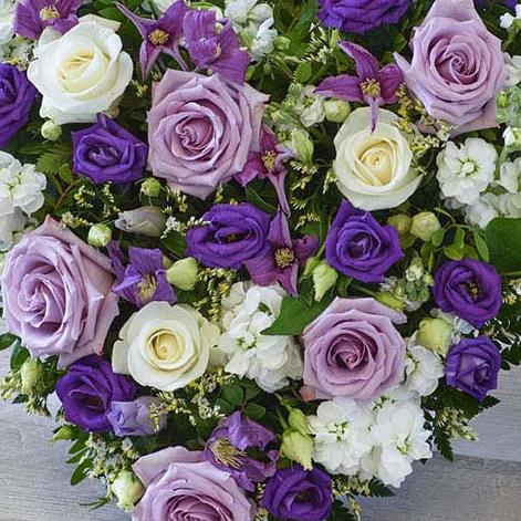 A heart tribute in beautiful purple and white shades, featuring fragrant stocks and lilac roses.