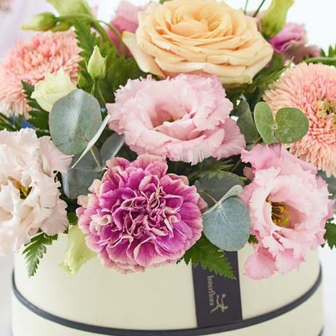 Pull out all the stops with the ultimate hatbox showstopper. No, we're not talking about a big fluffy hat, we're talking about gorgeous fresh flowers arranged just so in a stylish box.