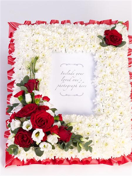 This very personal floral tribute features a photo of your loved one surrounded by a frame of fresh flowers. An abundance of white double spray chrysanthemums are contrasted with red short Stem roses, red spray carnations and white lisianthus, trimmed with eucalyptus and finished with ribbon.