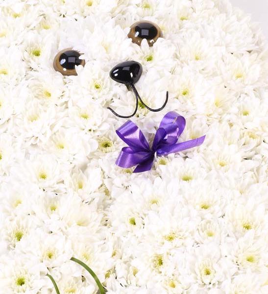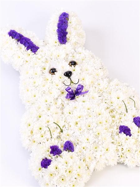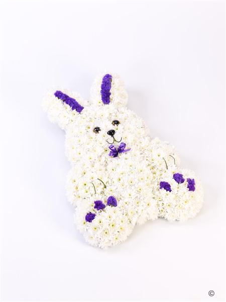 This sweet rabbit tribute is created using a mass of white double spray chrysanthemums, rich blue statice and Stems of steel grass. It is trimmed with a coordinating ribbon.