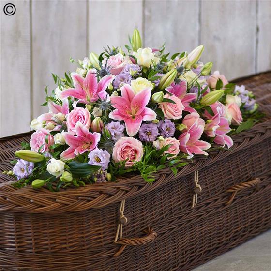 One of our most popular designs, this casket spray is a profusion of pastel blooms including pink and ivory roses and pink oriental lilies.