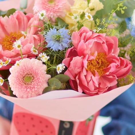 The season's showstopper – the perfect peony – meets a mix of gorgeous summery fresh pastel blooms. All expertly arranged by a talented local florist and tucked in our gorgeous strawberry patterned gift box.