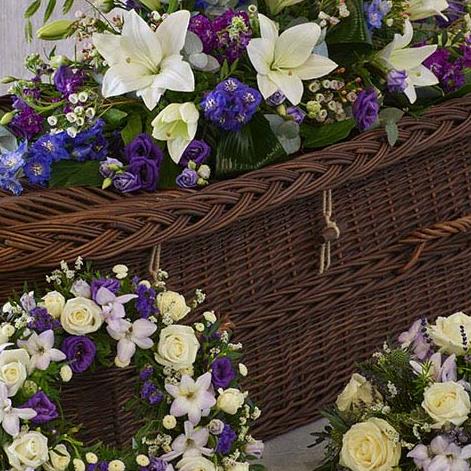 A collection of some of our most popular tributes - a casket spray, wreath and posy. Each features beautiful blooms in blue tones including roses, delphiniums, freesias and more.