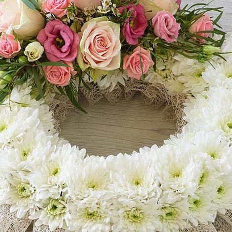 A traditional wreath of white chrysanthemums contrasted with a cluster of pretty roses, lisianthus and delicate foliage.
