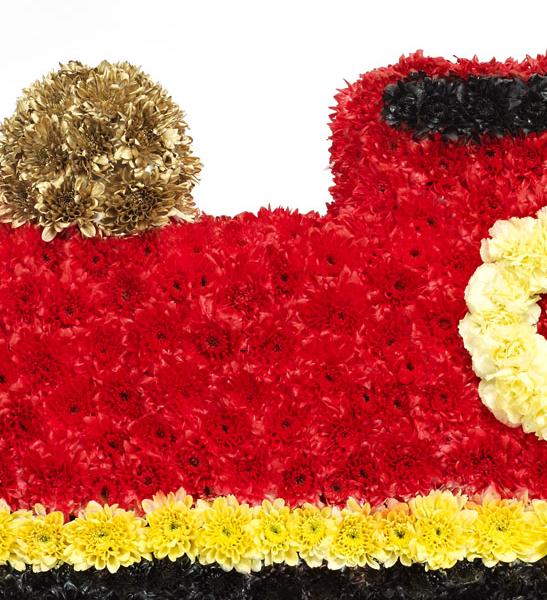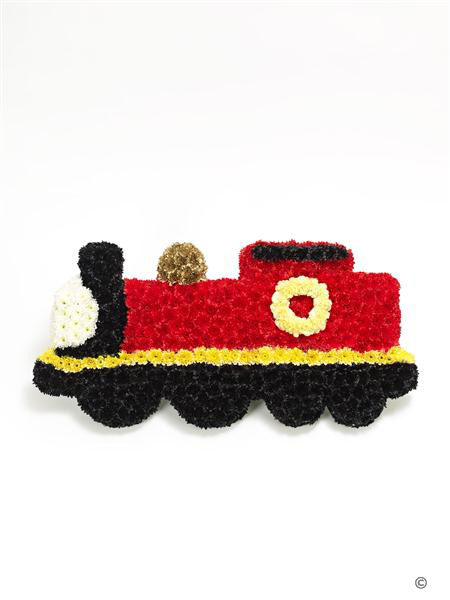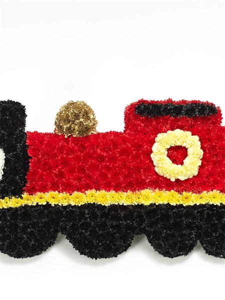 This train tribute is covered in a bed of fresh white double spray chrysanthemums and yellow spray carnations and finished with gold, red, yellow and black spray colours.