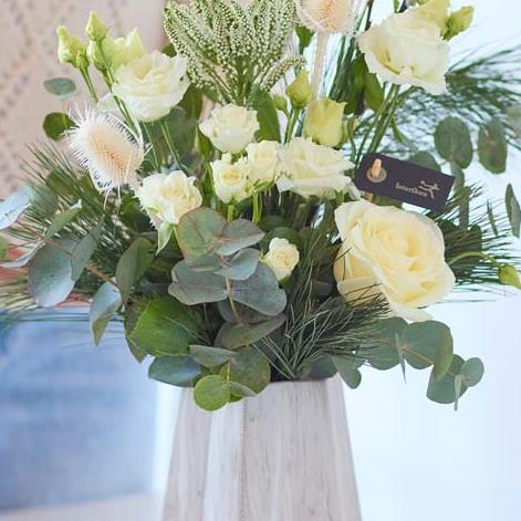 A striking angular grey vase filled with winter-inspired fresh and dried flowers, expertly arranged by a local florist.