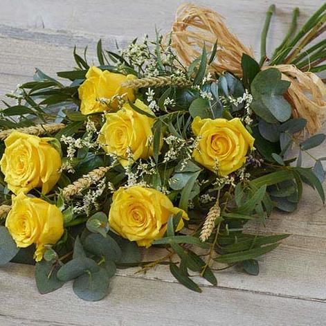 Gorgeous roses and eucalyptus beautifully combined with natural elements including dried wheat and a raffia bow.